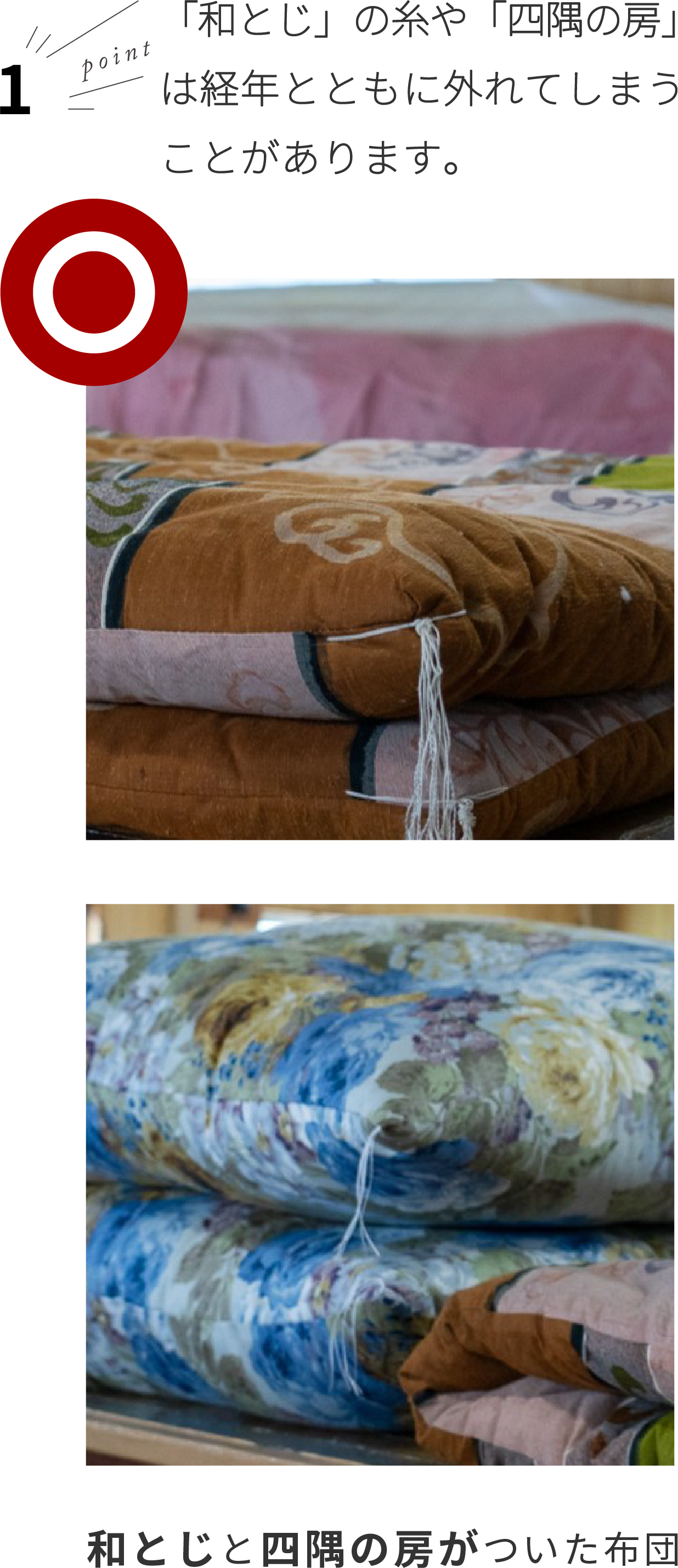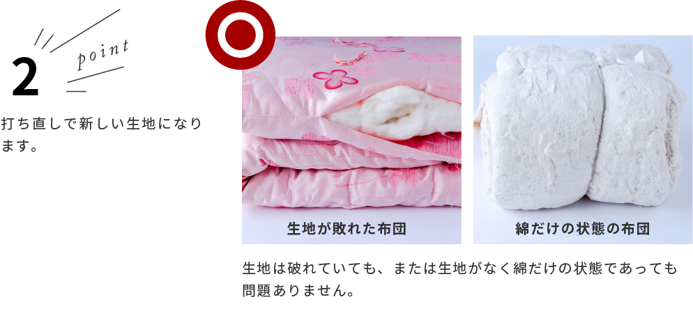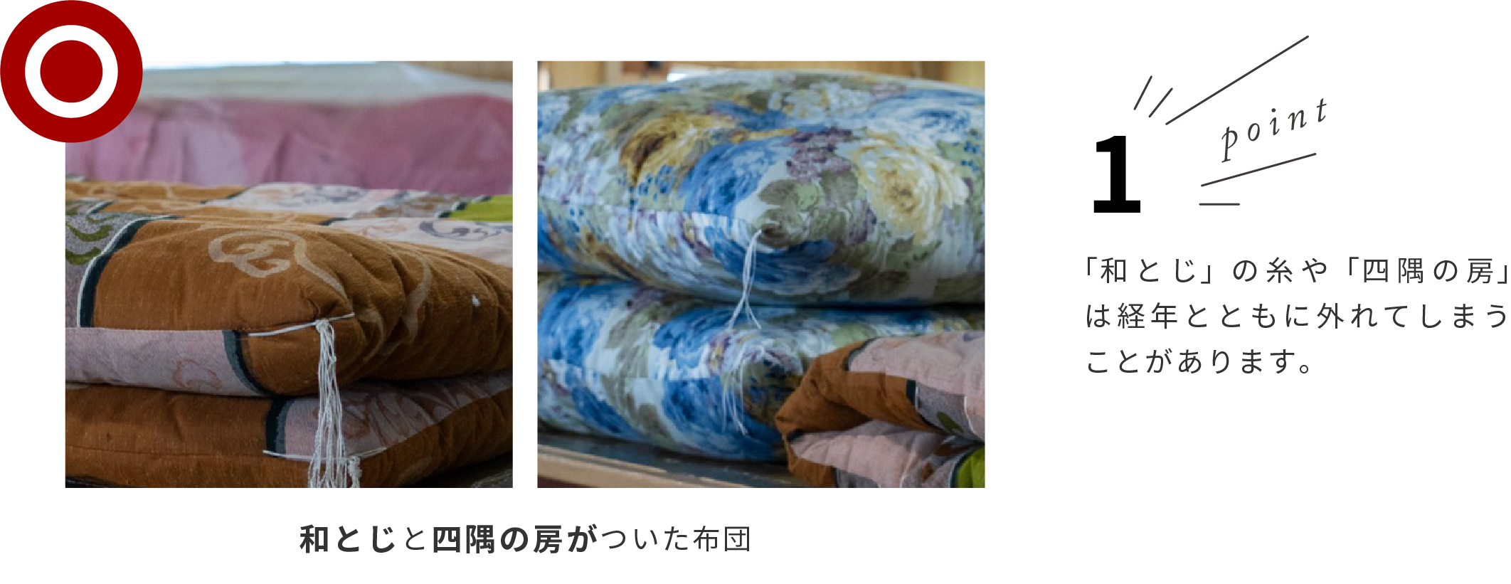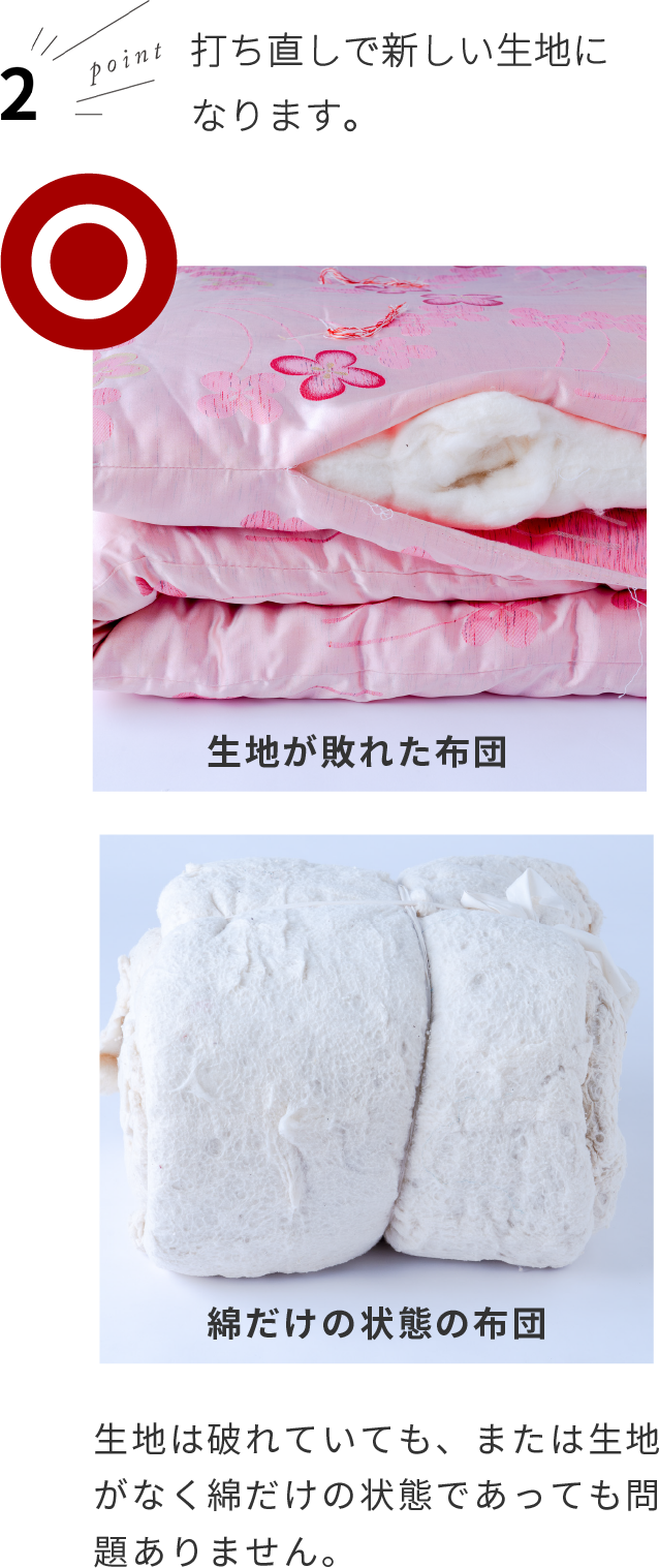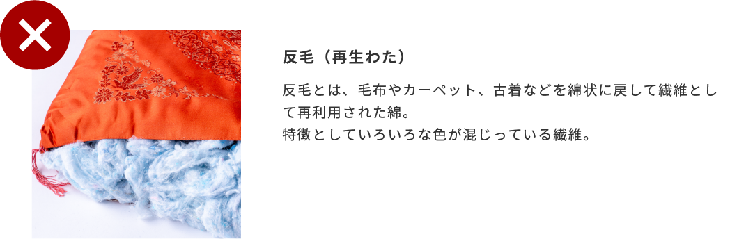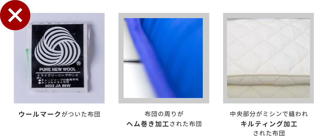 - キルト仕立てになっている布団の多くは、詰物が固綿・羊毛・羊毛ポリエステル素材のため、打ち直しができません。
