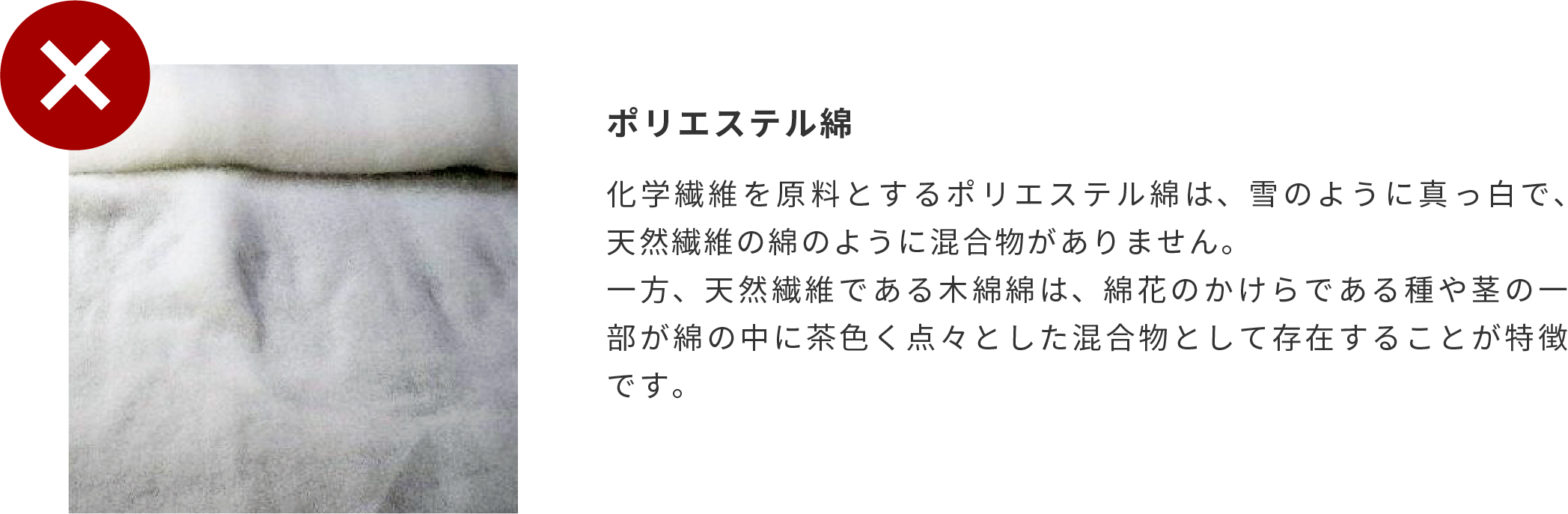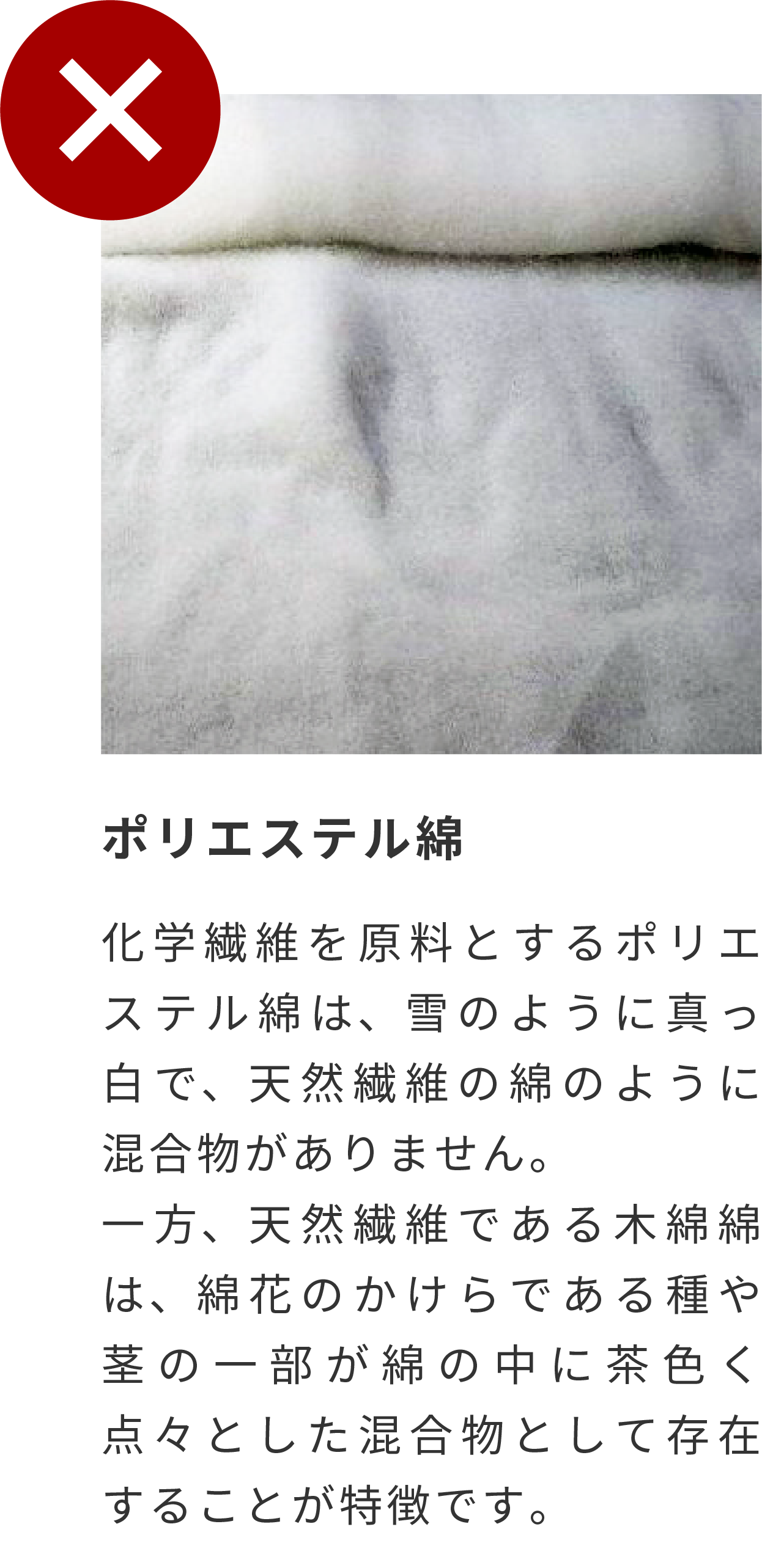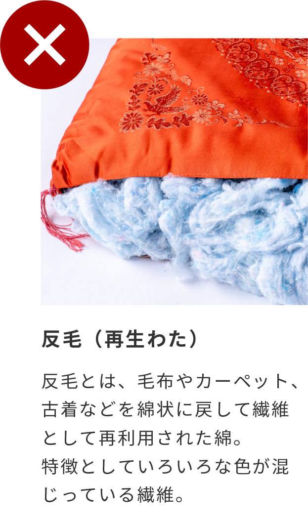 - スーパー、ディスカウントストア、訪問販売等で販売されている布団は、安価なポリエステルや羊毛ふとんが多く、もめん綿入り布団はほとんど販売されていません。